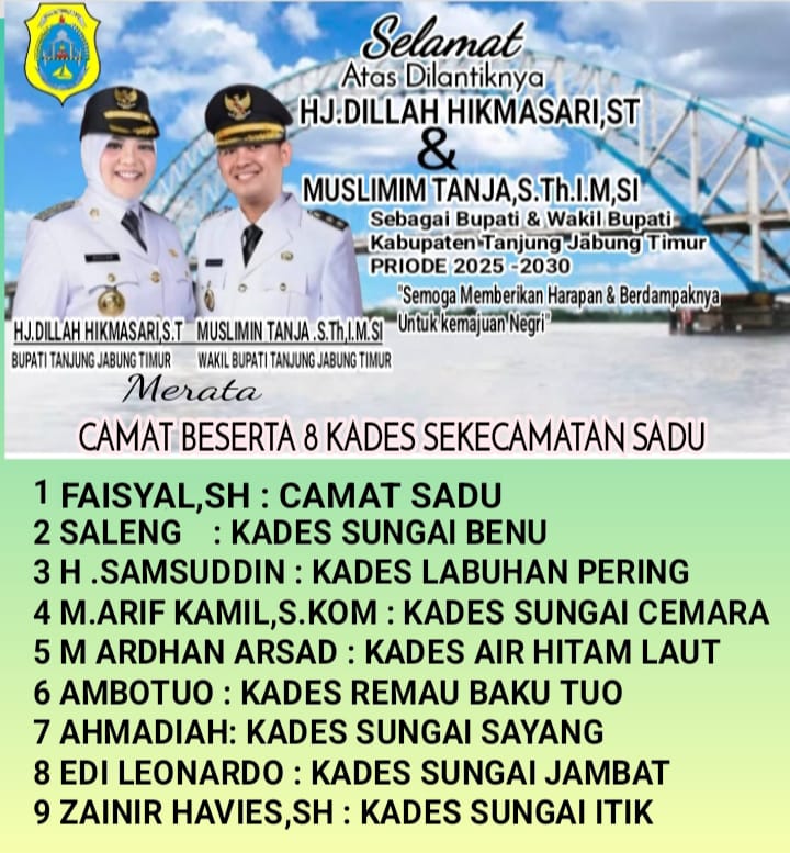 britanusantara.id, Tanjung Jabung Timur – Camat Sadu beserta kepala Desa se Kecamatan Sadu mengucapkan selamat atas pelantikan resmi Bupati dan wakil Bupati Tanjung Jabung Timur oleh Bapak Presiden Republik Indonesia H.Prabowo Subianto di istana merdeka Jakarta pada hari kamis 20/02/2025.