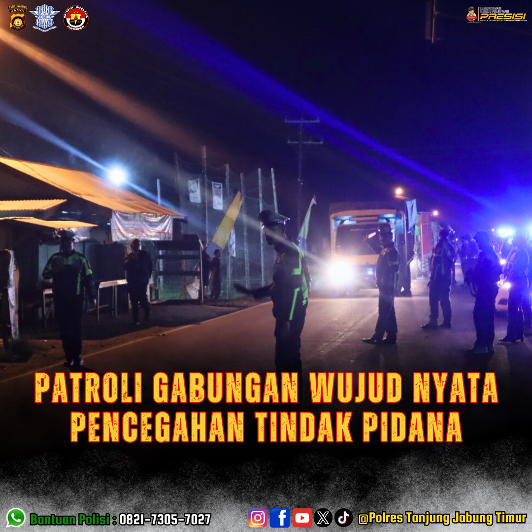 Britanusantara.id, Tanjabtim – Dalam rangka menjaga situasi keamanan dan ketertiban masyarakat (kamtibmas), Kepolisian Resor Tanjung Jabung Timur (Polres Tanjab Timur) menggelar patroli gabungan bersama fungsi operasional, Selasa malam (28/5/2025)